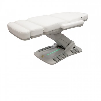Camilla de alta gama con estructura muy estable. Diseñada especialmente para optimizar el espacio de trabajo gracias a la rotación del sillón de 240º.Dispone de 4 motores que controlan la altura, la inclinación del respaldo, del asiento y del reposapiés.Reposabrazos abatibles.Las botoneras y los pedales integrados permiten un total control de los movimientos desde cualquier punto de la camilla.Incluye sistema de bloqueo por seguridad y botón de parada de emergencia.Tiene también 2 posiciones de memoria y función RST de retorno a la posición inicial.Luces LED de colores intercambiables en la base y en los botones de control.Acolchado ultrablando de gran confort con tapizado PU blanco de alta calidad. Este producto está diseñado según reglamento de productos sanitarios 2017/745.