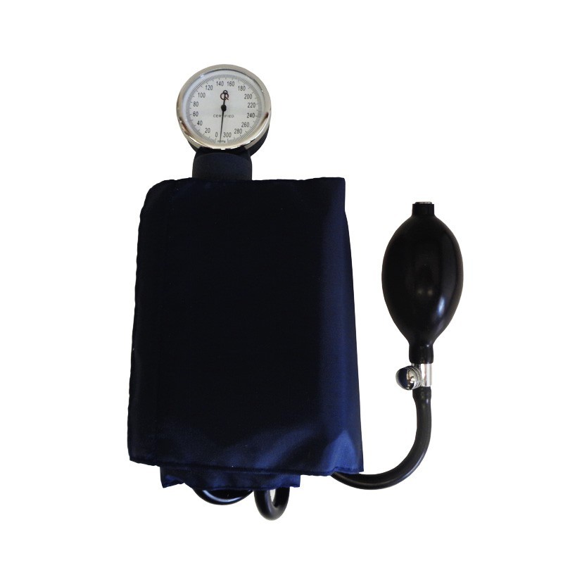 Incorpora un brazalete ajustable, manómetro y pera de goma con válvula para inflado.