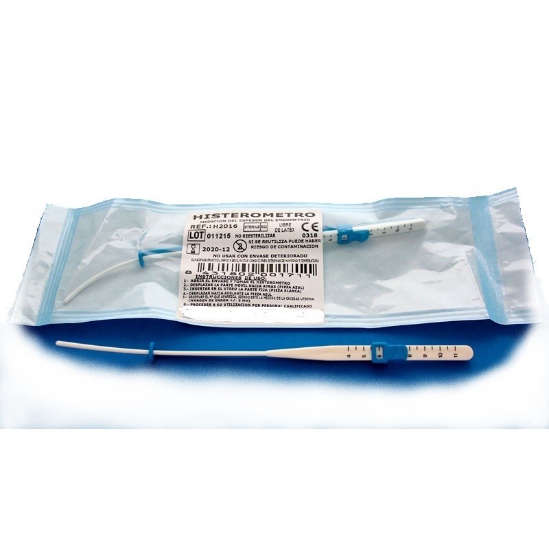 Instrumento que se utiliza para la medición del endometrio.Compuesto por dos piezas plásticas, una de ellas fija con indicaciones numéricas visibles a través de una pequeña ventana en la parte móvil de color azul, y la parte fija (blanca), es la que sirve de agarre del instrumento.En la parte móvil (azul) en su extremo presenta una especie de arandela que sirve de tope para obtener la medición.El manejo es muy sencillo, dando unos datos fácilmente visibles y de una alta precisión.Medida:14 centímetros.Un sólo uso.