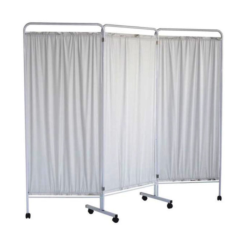 Biombo blanco de tres cuerpos con ruedas para clínicas y hospitales.
