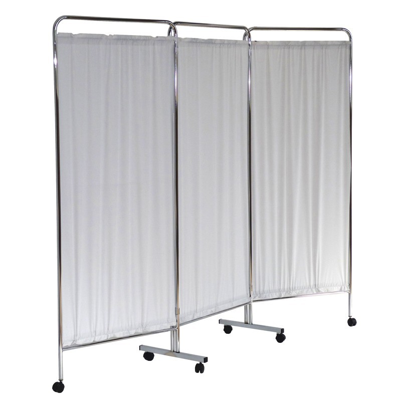 Biombo de acero inoxidable de tres cuerpos con ruedas para clínicas y hospitales.