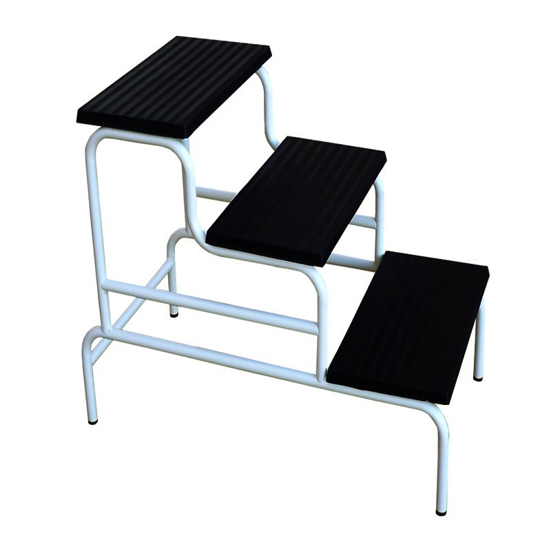 Banqueta de tres tramos en tubo de acero pintado blanco con piso antideslizante negro.