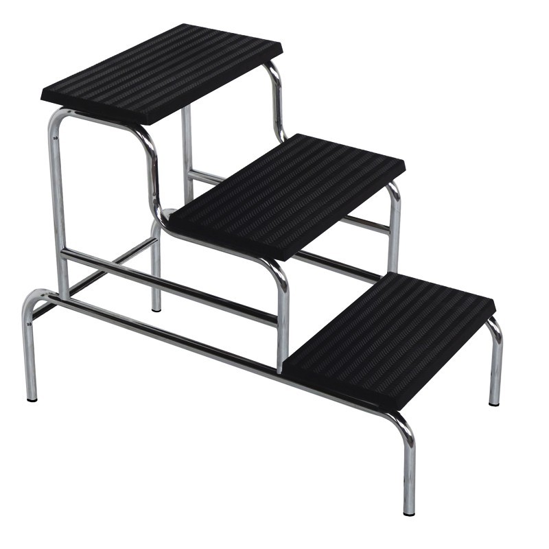 Banqueta de tres tramos en tubo de acero inoxidable con piso antideslizante negro.