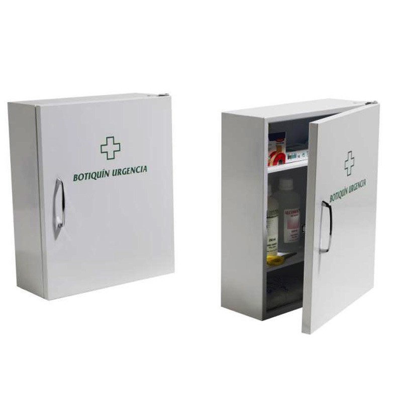 Botiquin fabricado en chapa de hierro esmaltado en blancoCon asa para facilitar la apertura de la puerta.Contenido.