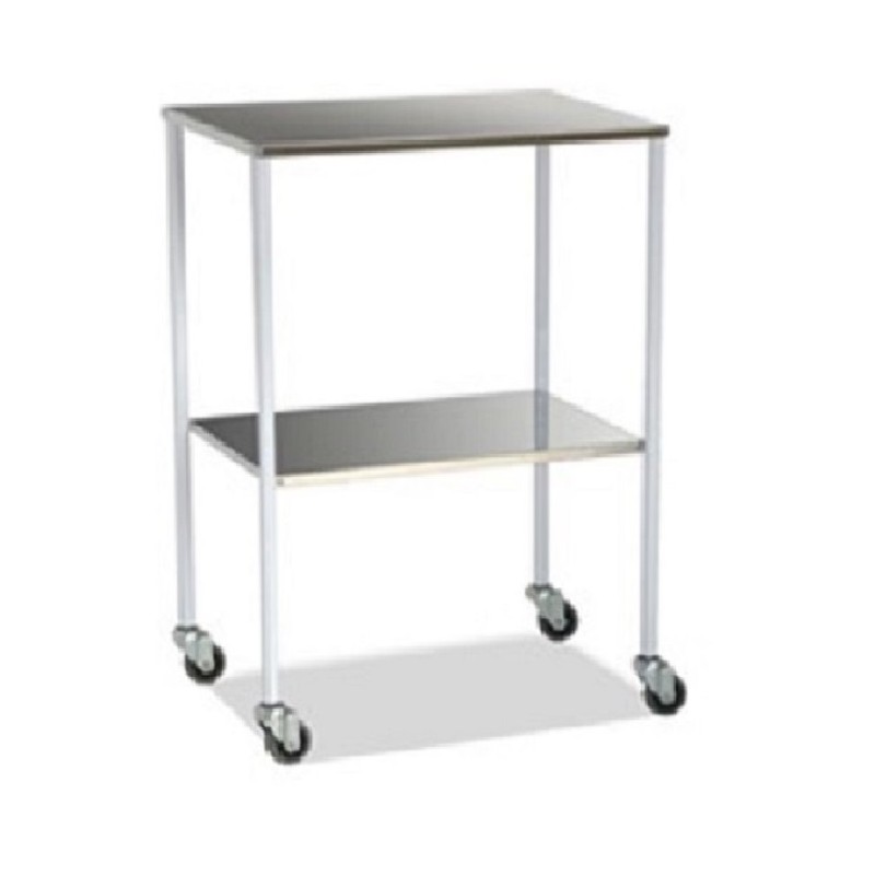 Mesa auxiliar fabricada en tubo de acero pintado en blanco, dos estantes lisos en acero inoxidable y ruedas giratorias.
