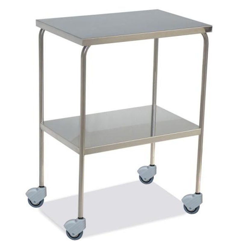 Mesa auxiliar de acero inoxidable, con dos estantes lisos en acero inoxidable y ruedas giratorias.