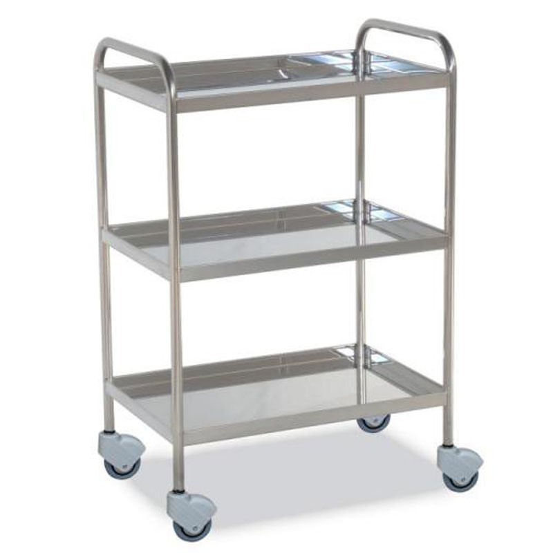 Mesa auxiliar de acero inoxidable, con tres estantes lisos en acero inoxidable con reborde a todos los lados y ruedas giratorias.