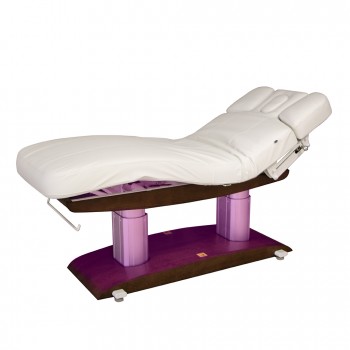 Camilla de SPA de 4 motores que regulan la altura y la inclinación del respaldo,del reposapiés y de toda la camilla.Colchón de una única pieza con 3 secciones.Reposabrazos ajustables y cabezal con agujero facial.Estructura metálica con acabado de madera color oscuro.Acolchado ultrablando de gran confort con tapizado PU blanco de alta calidad.La base incluye un sistema de iluminación LED de colores intercambiables que puede adaptarse a cada centro. portarrollos incorporado.