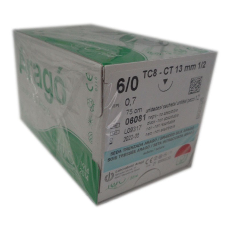 La sutura de seda 6/0 TC-8 no absorbile esta formada por hilos de fibras de seda trenzados teñidos de negro.