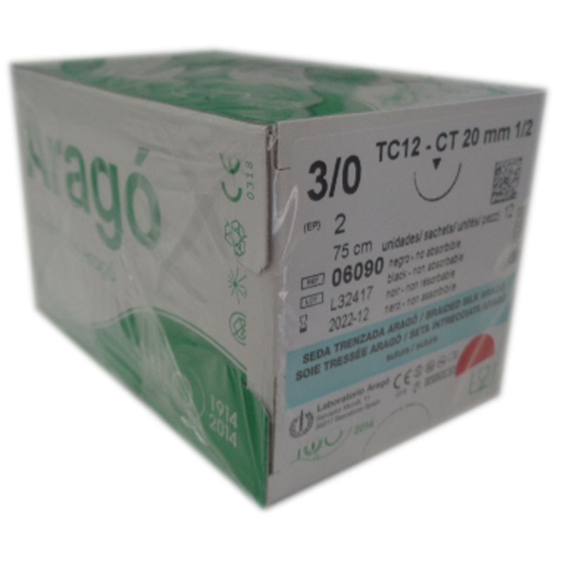 La sutura de seda 3/0 TC-12 no absorbile esta formada por hilos de fibras de seda trenzados teñidos de negro.