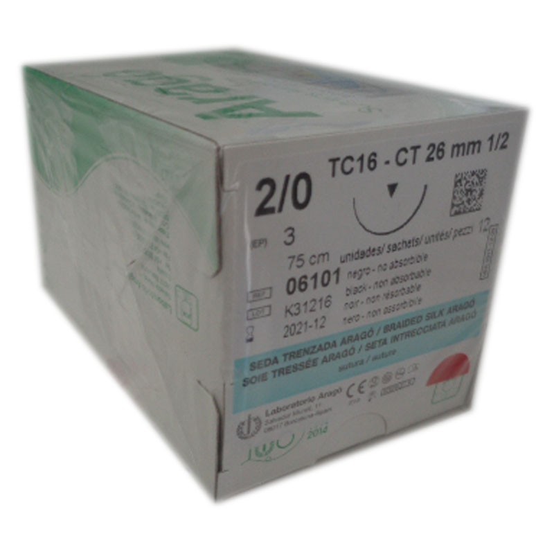 La sutura de seda negra 2/0 TC-16 no absorbile esta formada por hilos de fibras de seda trenzados teñidos de negro.