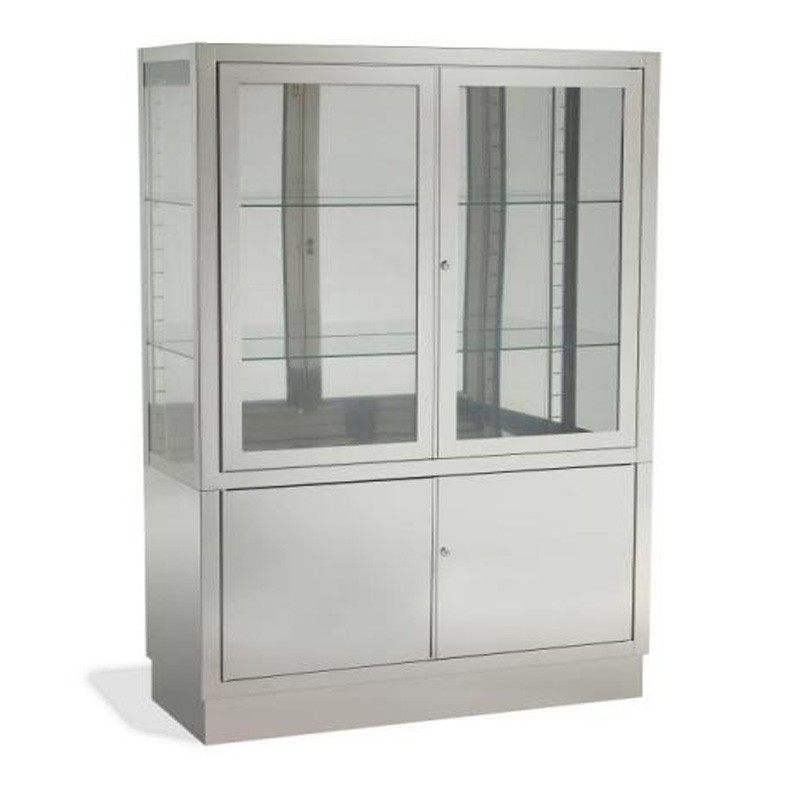 Vitrina de pie con 2 puertas superiores de cristal templado y la parte inferior con armario de 2 puertas metálicas.