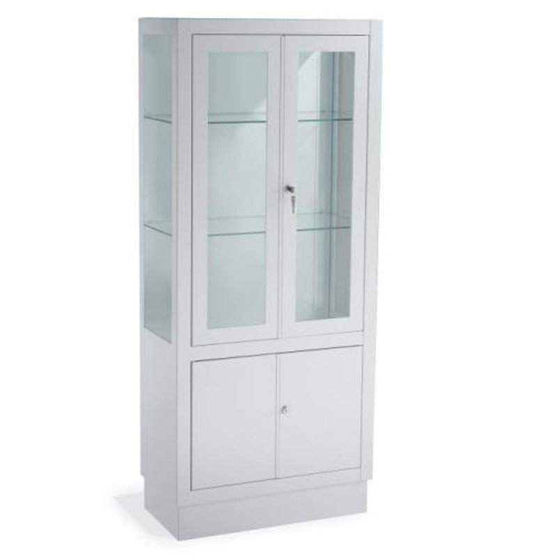 Vitrina de pie con 2 puertas superiores de cristal templado y la parte inferior con armario de 2 puertas metálicas.